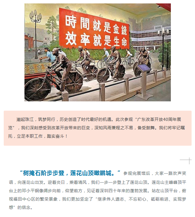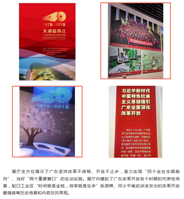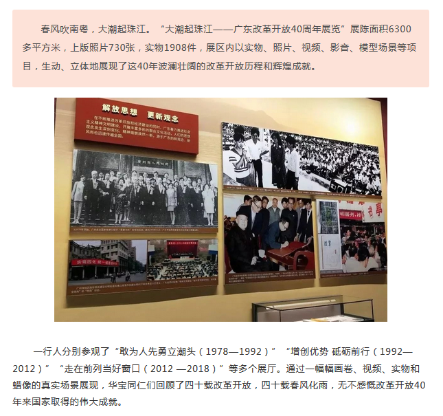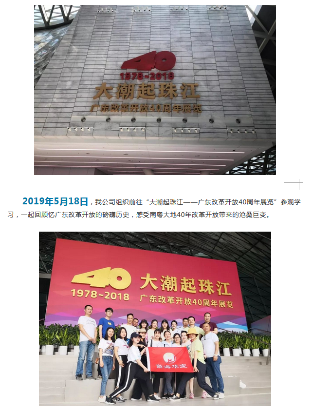 2019年5月18日,我公司组织前往“大潮起珠江——广东改革开放40周年展览”参观学习,一起回顾忆广东改革开放的磅礴历史,感受南粤大地40年改革开放带来的沧桑巨变。