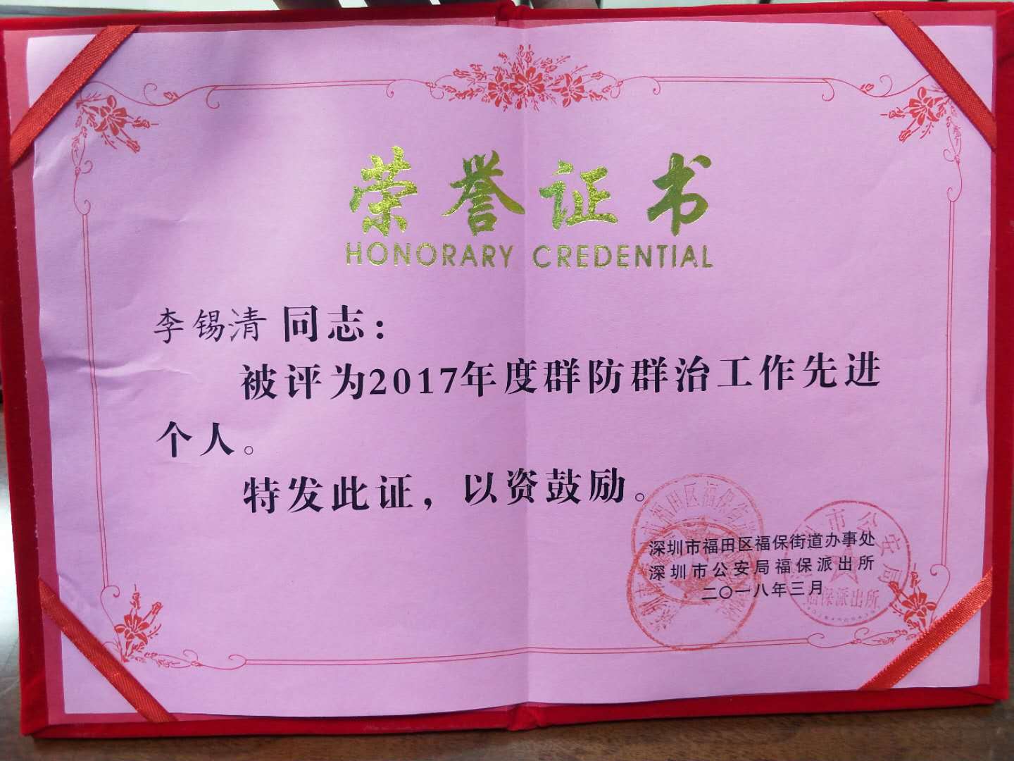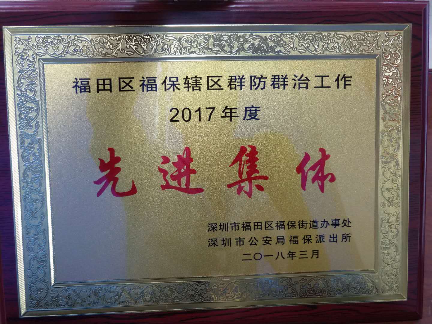 近日,深圳市福田区福保街道办事处及深圳市公安局福保派出所表彰了2017年度福田区福保辖区群防群治工作先进集体和先进个人。