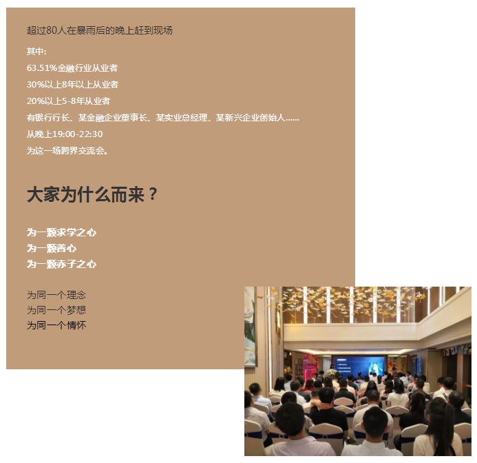 2018年6月19日晚,深圳读书会金融分会开幕。超过80人在暴雨后的晚上赶到现场,其中63.51%金融行业从业者、30%以上8年以上从业者、20%以上5-8年从业者……