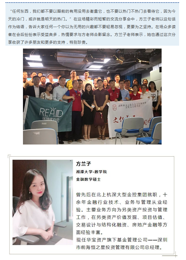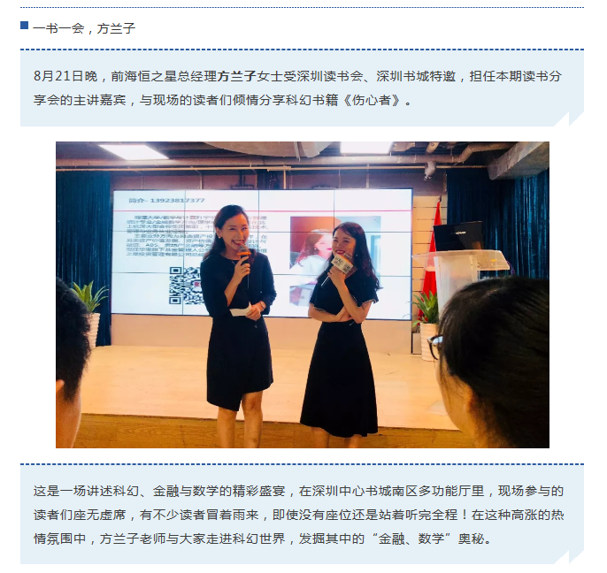8月21日晚,前海恒之星总经理方兰子女士受深圳读书会、深圳书城特邀,担任本期读书分享会的主讲嘉宾,与现场的读者们倾情分享科幻书籍《伤心者》。