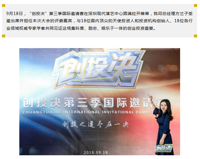 方兰子总经理受邀担任“创投决”第三季国际邀请赛评委嘉宾