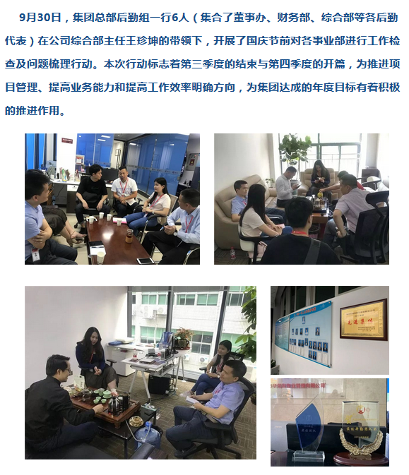 9月30日,集团总部后勤组一行6人(集合了董事办、财务部、综合部等各后勤代表)在公司综合部主任王珍坤的带领下,开展了国庆节前对各事业部进行工作检查及问题梳理行动。