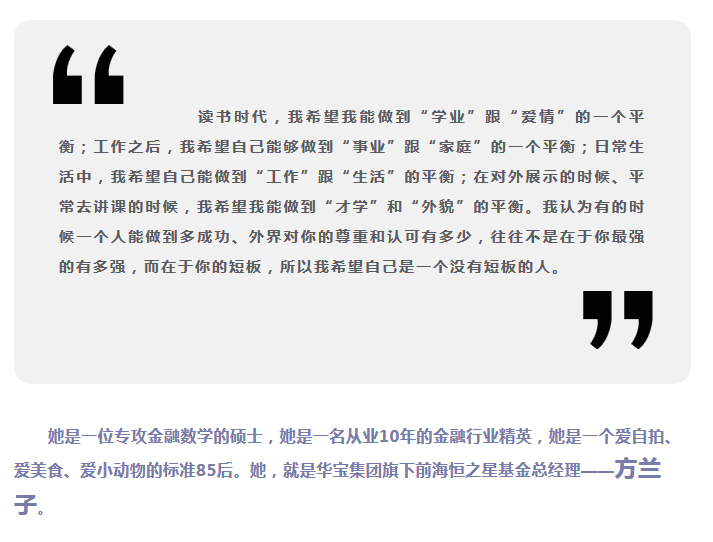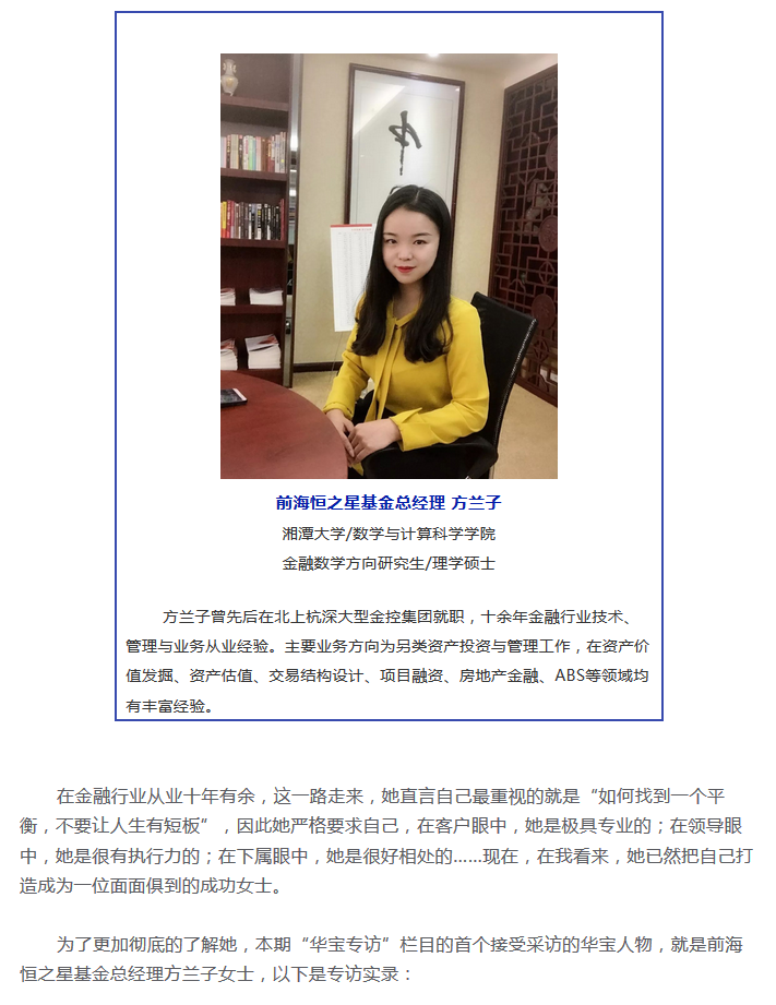 她是一位专攻金融数学的硕士,她是一名从业10年的金融行业精英,她是一个爱自拍、爱美食、爱小动物的标准85后。她,就是华宝集团旗下前海恒之星基金总经理