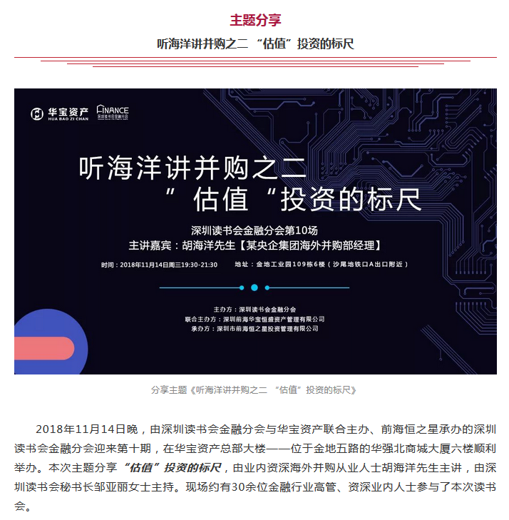 2018年11月14日晚,由深圳读书会金融分会与华宝资产联合主办、前海恒之星承办的深圳读书会金融分会迎来第十期