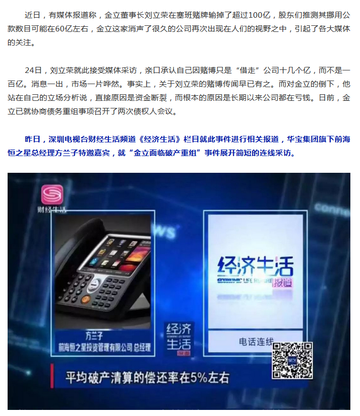 深圳电视台财经生活频道《经济生活》栏目就此事件进行相关报道,华宝集团旗下前海恒之星总经理方兰子特邀嘉宾