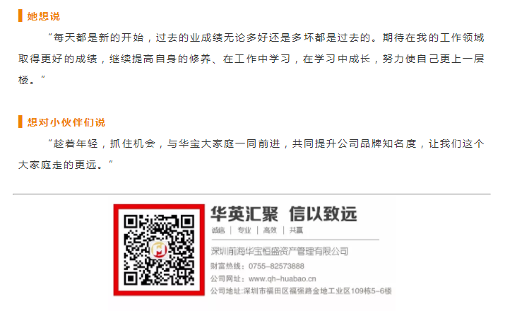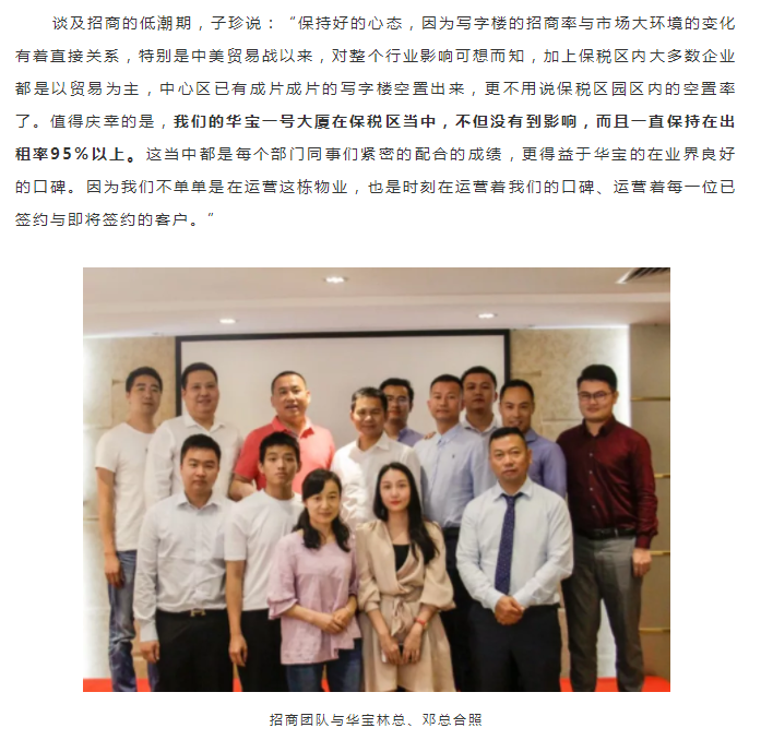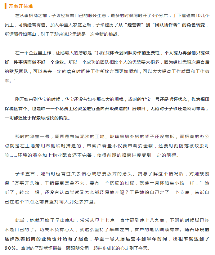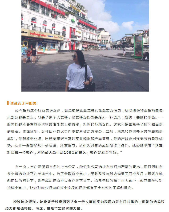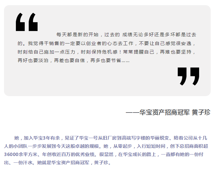 她,加入华宝3年有余,见证了华宝一号从旧厂房到高端写字楼的华丽蜕变、陪着公司从十几人的小团队一步步发展到今天这般卓越的规模。她,从零起步,入行短短时间,创下总招商面积超36000余平方米、年创收近百万的优秀业绩……
