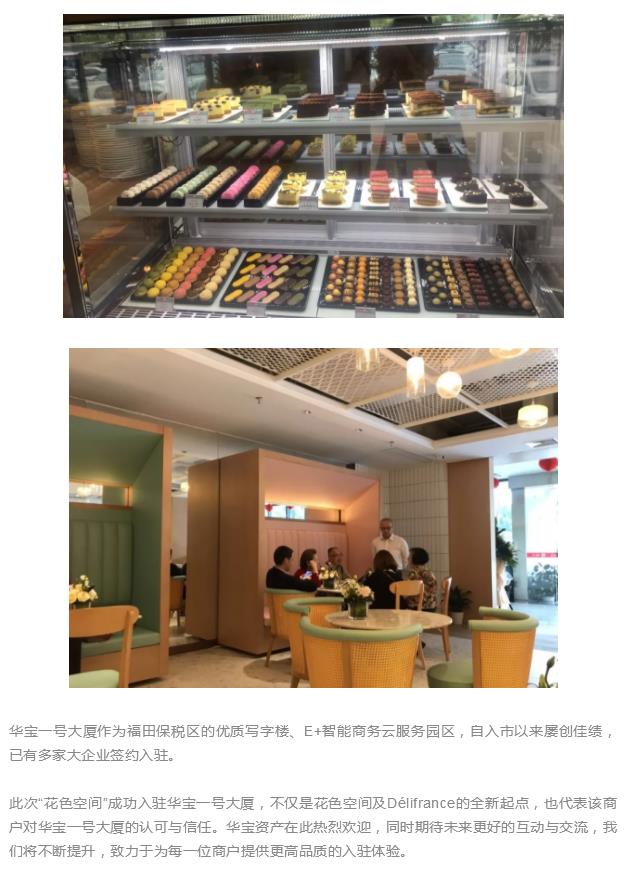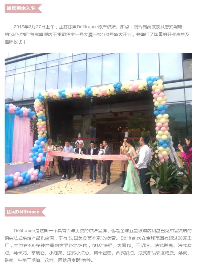 2019年3月27日上午,主打法国Délifrance原产烘焙、甜点,融合高端茶饮及意式咖啡的“花色空间”首家旗舰店于我司华宝一号大厦一楼103号盛大开业。
