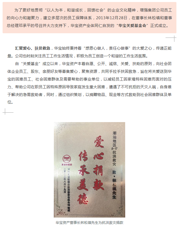 2013年12月28日,在董事长林松填和董事总经理邓承平的号召并大力支持下,华宝资产全体同仁自发的“华宝关爱基金会”正式成立。
